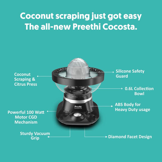 Preethi Cocosta Kp001 Coconut Scraper&Citrus Juicer,100% Safe Dual Protection Scraper With Safety Switch&Silicon Cap,Spillage Free Collection Bowl,100 Watt,2Yr Guarantee,Lifelong Free Service