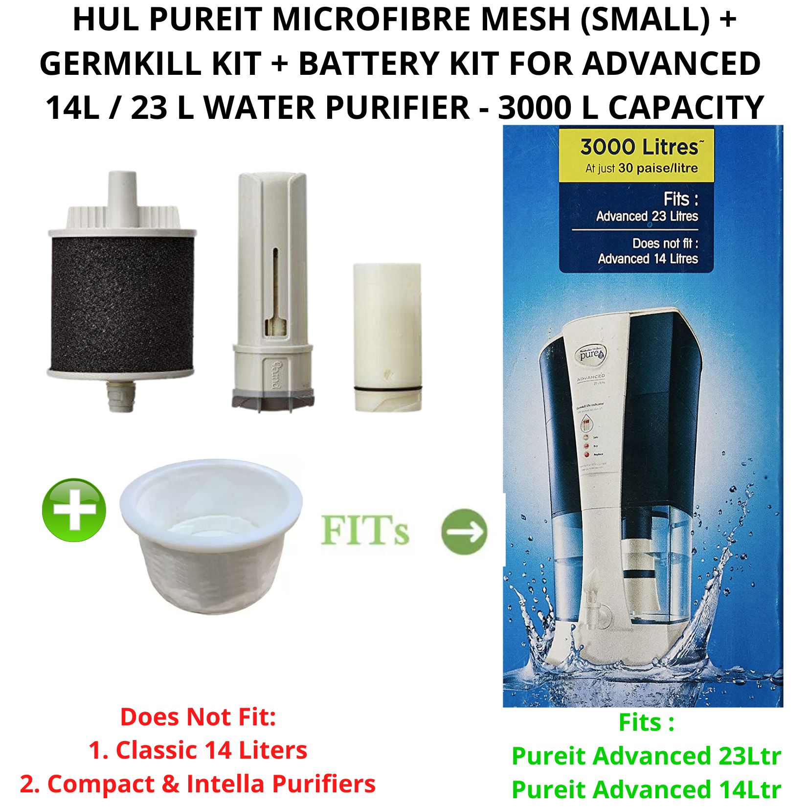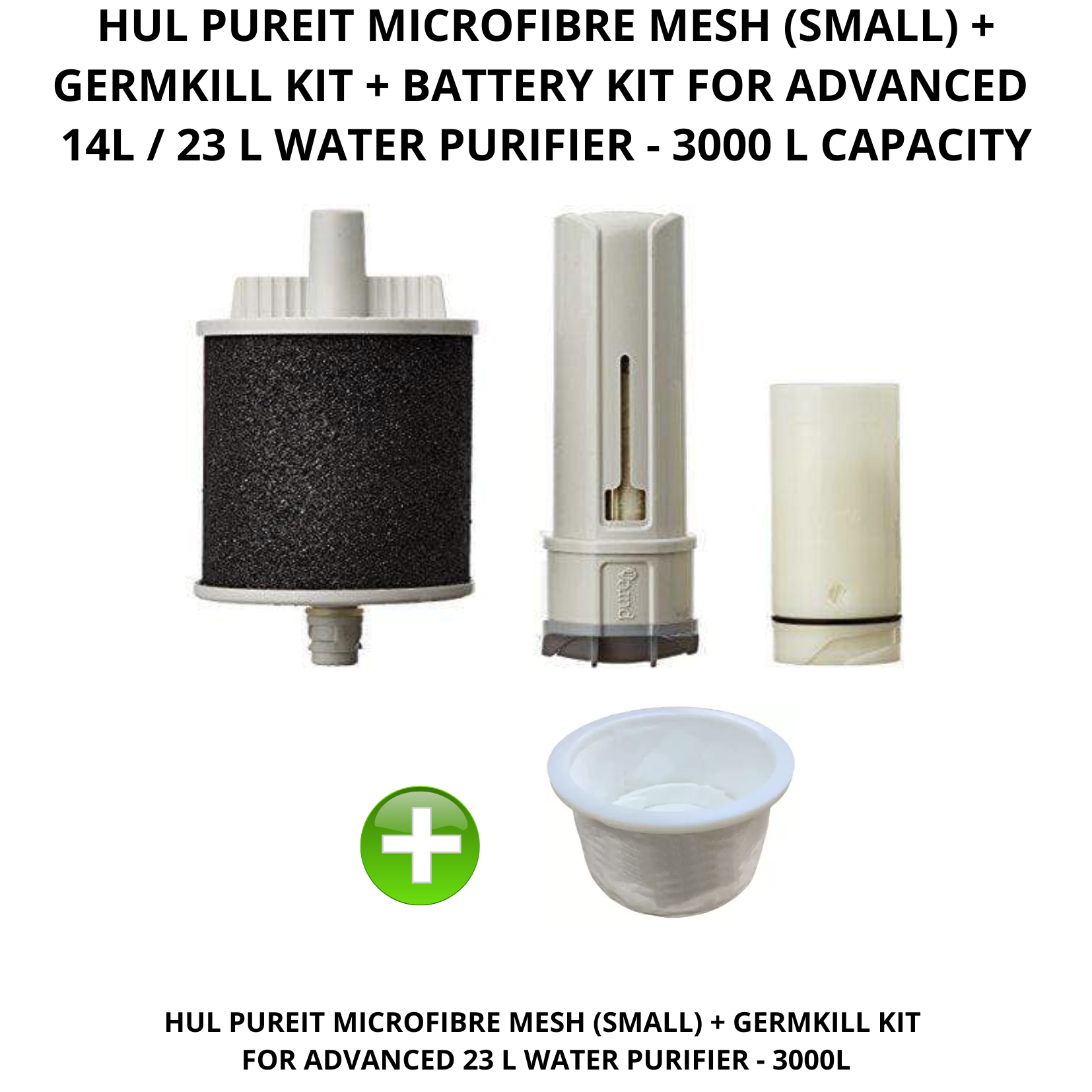 Touch N Feel ~ HUL PUREIT MICROFIBRE MESH(SMALL)+GERMKILL KIT+ BATTERY KIT FOR ADVANCED 14L/23L-3000L Media Filter Cartridge Micro rating 0.4, (Pack of 4 ~ Microfibre Mesh: 1, Germkill kit: 1, Battery Kit: 1, Carbon Polisher: 1)